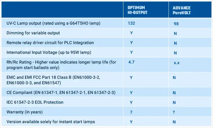 Our new OPTIMUM HI-OUTPUT SERIES UV ballasts, specifically designed for UV-C HO lamps (800 mA), accommodate a power range from 18W to 95W with an input range of 100-277V (+/- 10%), or up to 155W at an input voltage range of 220V-277V (+/- 10%). Available in both program start and instant start versions (75W-155W only), these ballasts also feature a remote relay driver circuit for seamless PLC integration and dimming/variable output capabilities for enhanced energy efficiency. All models adhere to the latest CE and European safety requirements, are RoHS 3 Compliant, cULus Listed, and designed to ensure reduced EMC emissions.For more detail about these products and to compare their numerous advantages to the Advance Pure Volt series product line.